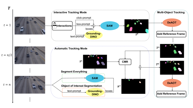 25 May 2023Track Anything (TAM)の2週間後に出たSAM x 物体領域追跡の論文.初期マスクをSAMで,追跡は既存追跡器でという構成はTAM同様.自然言語によるプロンプティングができること,新物体を自動追加できることが新しい.