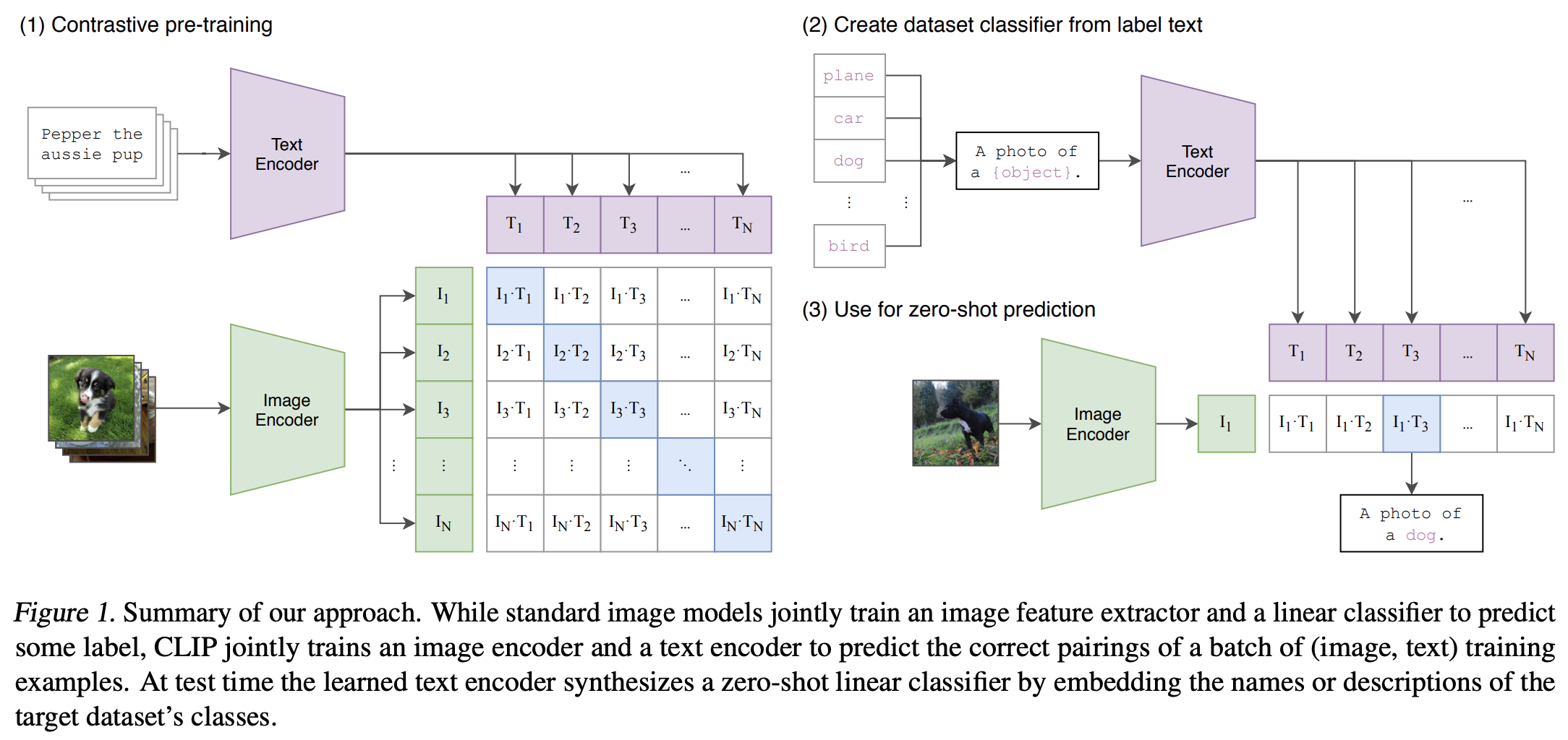 - 各画像埋め込みに対して,バッチ中のテキスト埋め込みのうちどれが画像とペアになっていたテキストの埋め込みかを当てる対照学習タスクで2つのエンコーダを学習