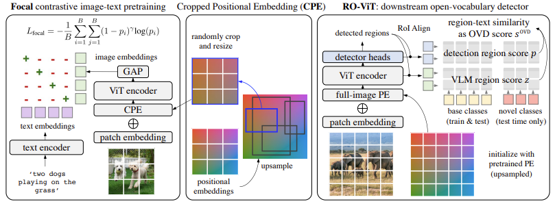 16 Jun 2023語彙を限定しない物体検知に向けた事前学習方法としてCLIP型のテキスト・画像対照学習アルゴリズム RO-ViT を提案.画像単位でキャプションが付いているデータで画像に局在する物体の表現を学習するため,位置埋め込みをクロップして足し合わせる.