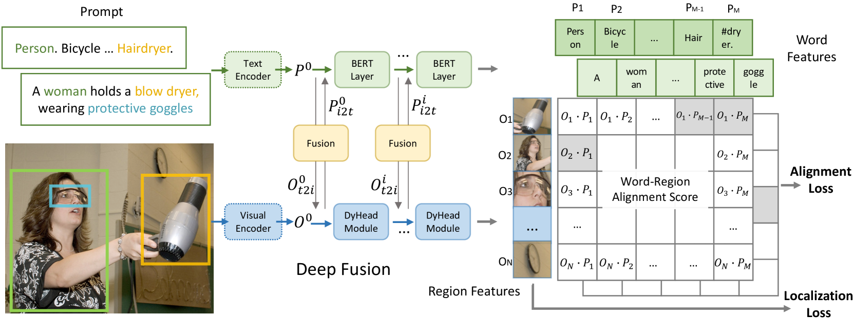 - Groundingのalignment loss:テキストエンコーダに符号化されたテキストのフレーズ特徴量と,視覚的エンコーダに符号化された物体領域の特徴量とを整合させる